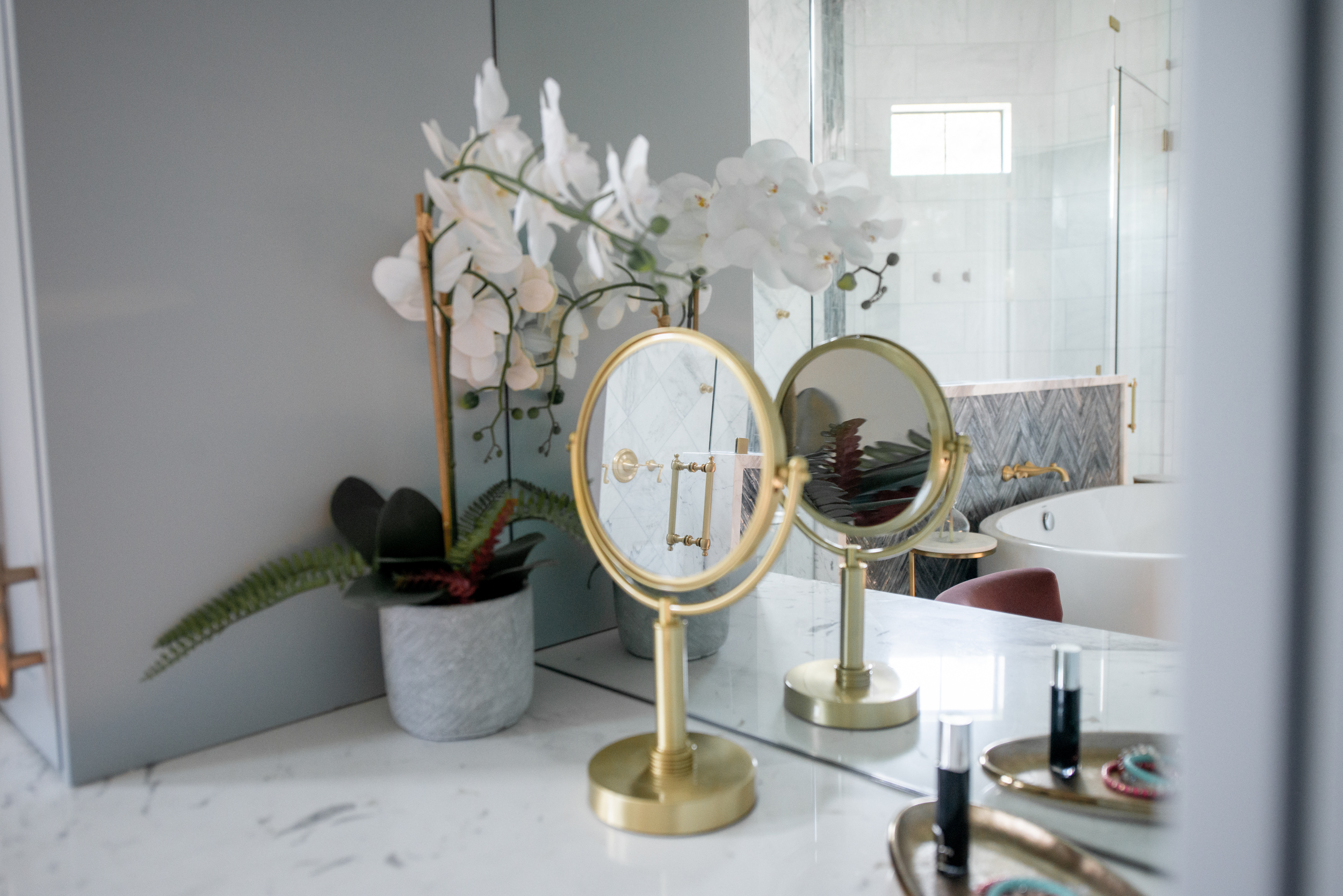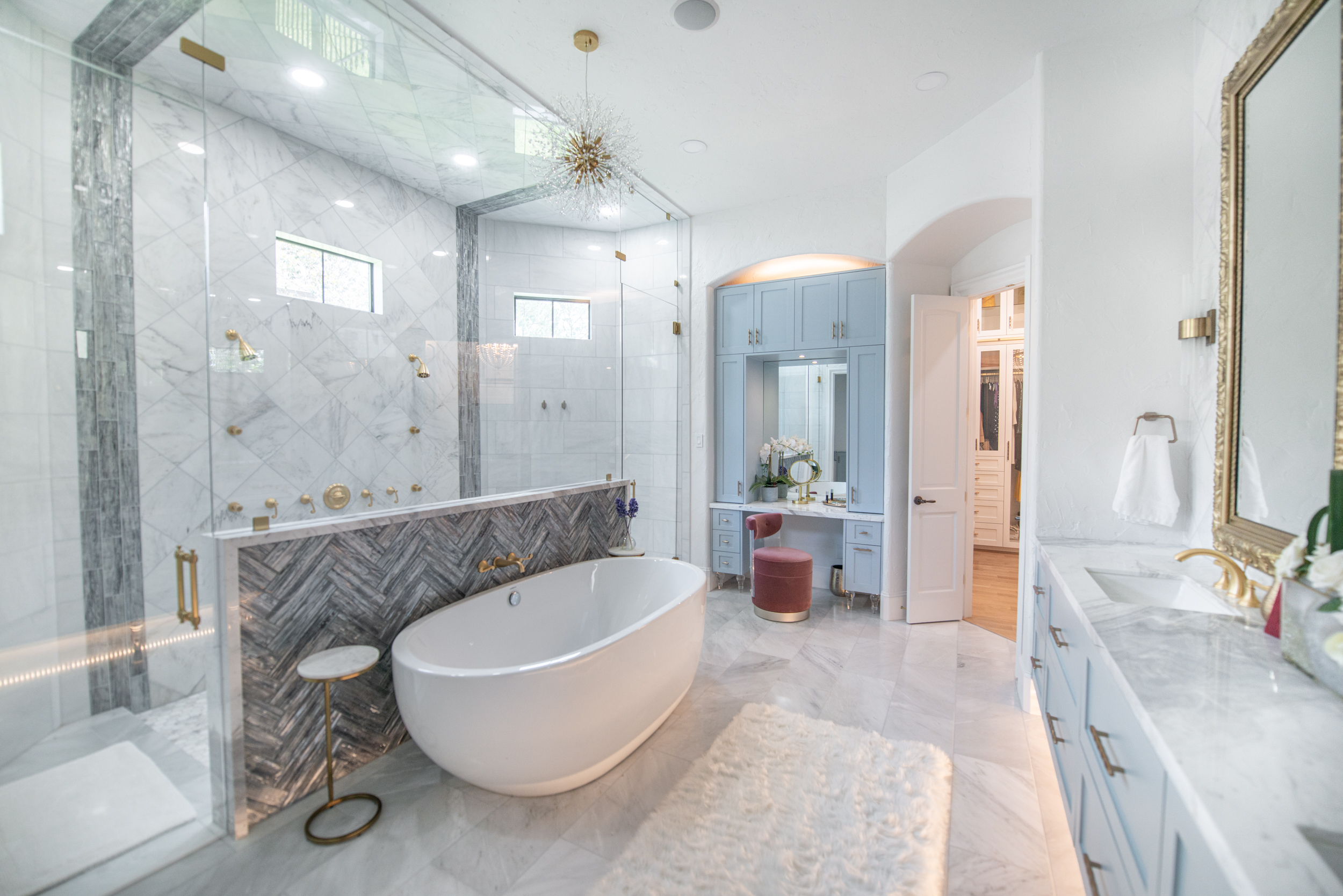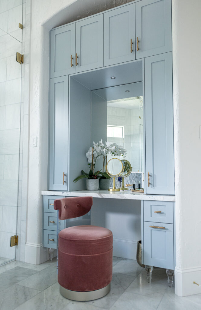 Who doesn't love the perfect blend of a modern design with a traditional adornments? The real star of the shoot was that awesome vanity chair!